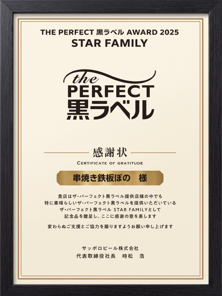 口当たりの良さを決める「クリーミーさ」、美味しさをそそるグラスの「クリアさ」、ビールのうまみを最大限に引き出す「温度」。3つの基準を高いレベルでクリアした店舗だけに、サッポロの認定書は送られます。 最高と考えるビールを、最高の状態で楽しんでもらうために。自宅では味わえないビールの美味しさが楽しめるお店。それが串焼き鉄板「ぼの」なのです!